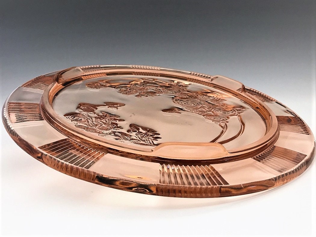 View Depression Glass Pink Cake Plate Pictures. Vintage miss america pink depression glass cake plate, 1930s anchor hocking glassware. This is a beautiful, pink, depression glass pedestal cake stand.