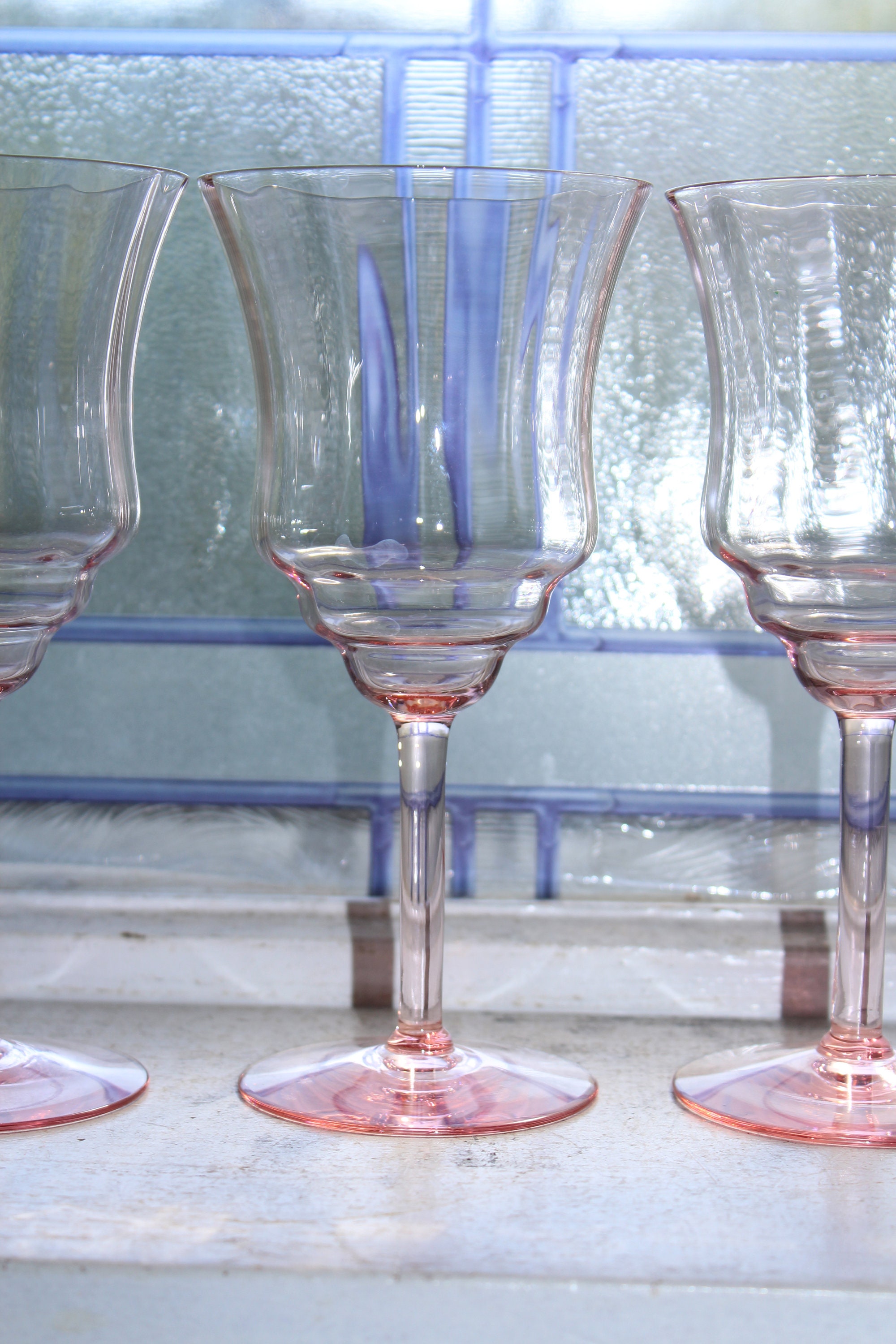 Get Depression Glass Pink Wine Glasses Pictures. Pink depression glass came in everything from servingware to stemware, but wine, champagne, and water goblets are some of the most collectible items. Pink depression wine glasses, 6.75 tall vintage stemware with a ribbed ball knop, etched flowers and optic panels, set of 3.